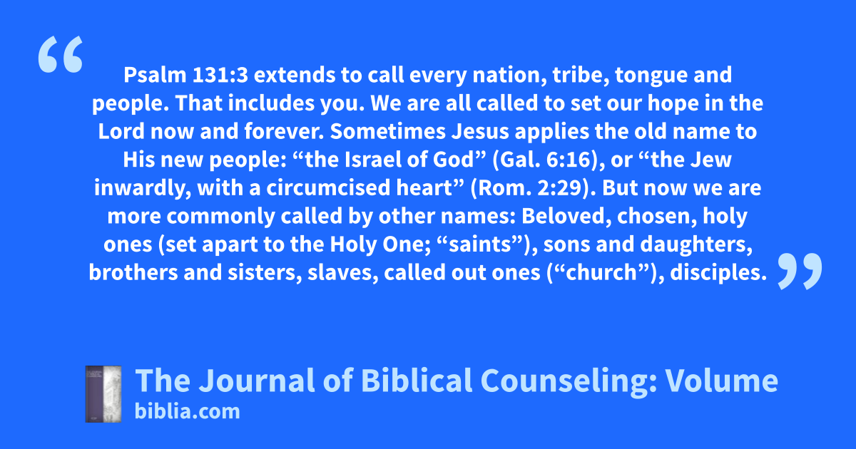 Psalm 131:3 extends to call every nation, tribe, tongue and people. That includes you. We are all called to set our hope in the Lord now and forever. Sometimes Jesus applies the old name to His new people: “the Israel of God” (Gal. 6:16), or “the Jew inwardly, with a circumcised heart” (Rom. 2:29). But now we are more commonly called by other names: Beloved, chosen, holy ones (set apart to the Holy One; “saints”), sons and daughters, brothers and sisters, slaves, called out ones (“church”), disciples.