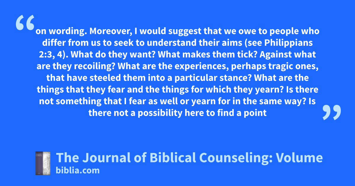 on wording. Moreover, I would suggest that we owe to people who differ from us to seek to understand their aims (see Philippians 2:3, 4). What do they want? What makes them tick? Against what are they recoiling? What are the experiences, perhaps tragic ones, that have steeled them into a particular stance? What are the things that they fear and the things for which they yearn? Is there not something that I fear as well or yearn for in the same way? Is there not a possibility here to find a point