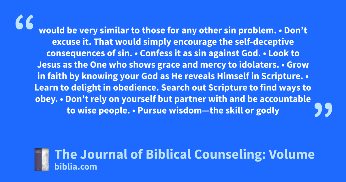 would be very similar to those for any other sin problem. • Don’t excuse it. That would simply encourage the self-deceptive consequences of sin. • Confess it as sin against God. • Look to Jesus as the One who shows grace and mercy to idolaters. • Grow in faith by knowing your God as He reveals Himself in Scripture. • Learn to delight in obedience. Search out Scripture to find ways to obey. • Don’t rely on yourself but partner with and be accountable to wise people. • Pursue wisdom—the skill or godly