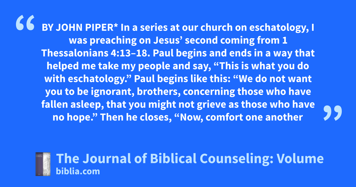 BY JOHN PIPER* In a series at our church on eschatology, I was preaching on Jesus’ second coming from 1 Thessalonians 4:13–18. Paul begins and ends in a way that helped me take my people and say, “This is what you do with eschatology.” Paul begins like this: “We do not want you to be ignorant, brothers, concerning those who have fallen asleep, that you might not grieve as those who have no hope.” Then he closes, “Now, comfort one another