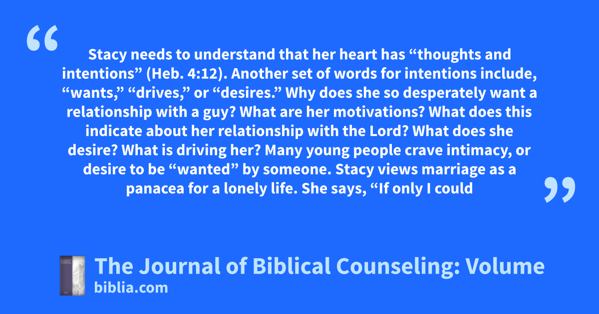Stacy needs to understand that her heart has “thoughts and intentions” (Heb. 4:12). Another set of words for intentions include, “wants,” “drives,” or “desires.” Why does she so desperately want a relationship with a guy? What are her motivations? What does this indicate about her relationship with the Lord? What does she desire? What is driving her? Many young people crave intimacy, or desire to be “wanted” by someone. Stacy views marriage as a panacea for a lonely life. She says, “If only I could