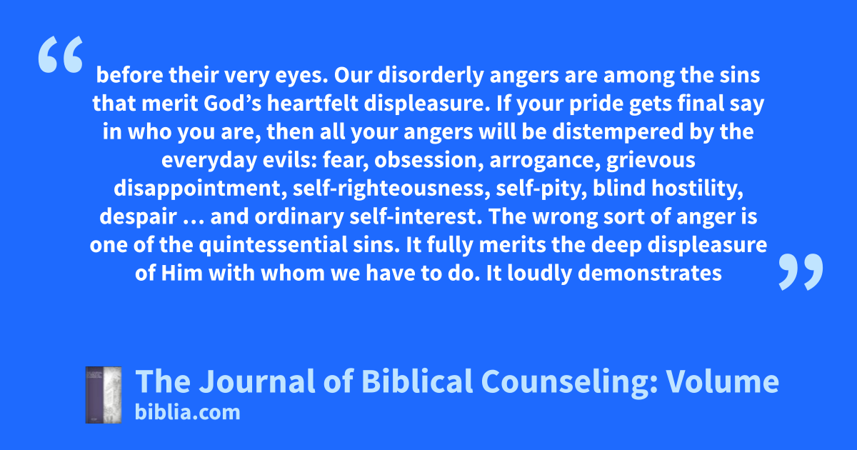 before their very eyes. Our disorderly angers are among the sins that merit God’s heartfelt displeasure. If your pride gets final say in who you are, then all your angers will be distempered by the everyday evils: fear, obsession, arrogance, grievous disappointment, self-righteousness, self-pity, blind hostility, despair … and ordinary self-interest. The wrong sort of anger is one of the quintessential sins. It fully merits the deep displeasure of Him with whom we have to do. It loudly demonstrates