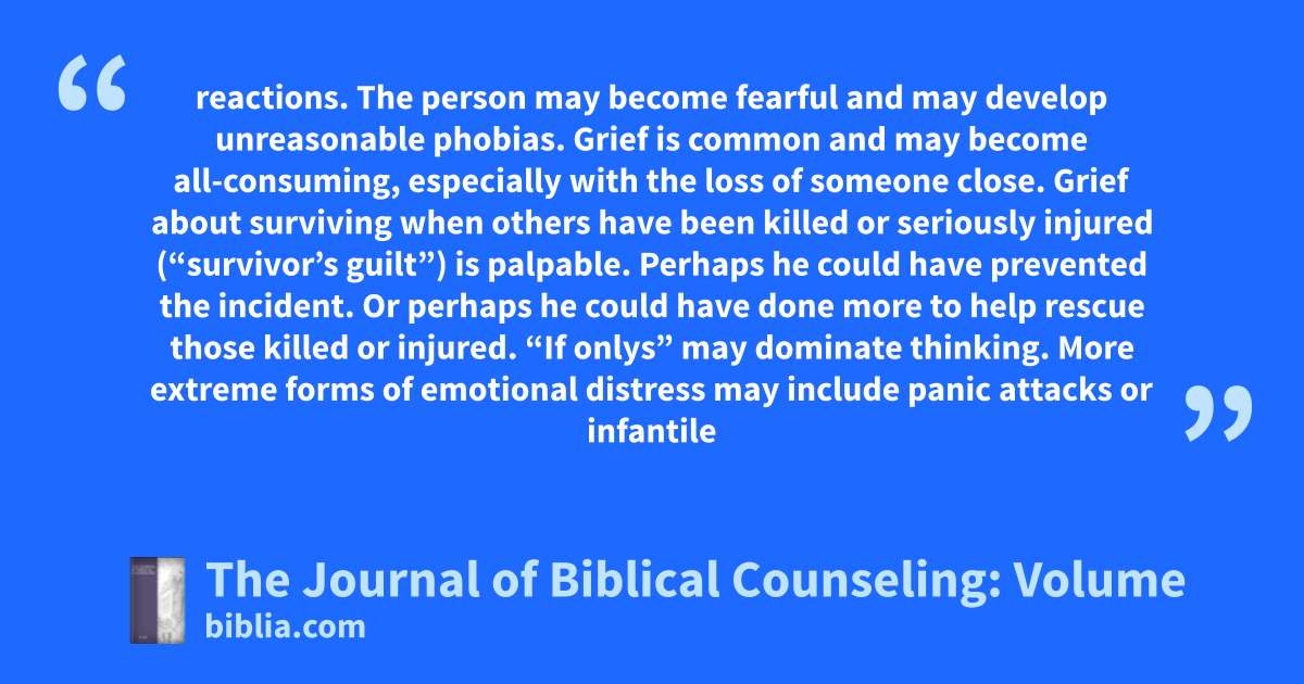 reactions. The person may become fearful and may develop unreasonable phobias. Grief is common and may become all-consuming, especially with the loss of someone close. Grief about surviving when others have been killed or seriously injured (“survivor’s guilt”) is palpable. Perhaps he could have prevented the incident. Or perhaps he could have done more to help rescue those killed or injured. “If onlys” may dominate thinking. More extreme forms of emotional distress may include panic attacks or infantile