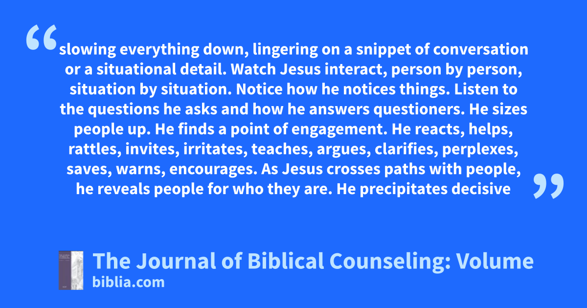 slowing everything down, lingering on a snippet of conversation or a situational detail. Watch Jesus interact, person by person, situation by situation. Notice how he notices things. Listen to the questions he asks and how he answers questioners. He sizes people up. He finds a point of engagement. He reacts, helps, rattles, invites, irritates, teaches, argues, clarifies, perplexes, saves, warns, encourages. As Jesus crosses paths with people, he reveals people for who they are. He precipitates decisive