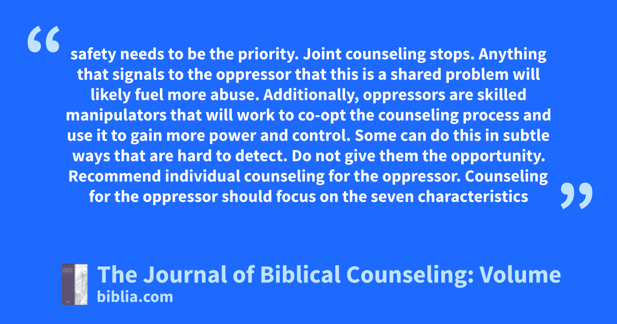 safety needs to be the priority. Joint counseling stops. Anything that signals to the oppressor that this is a shared problem will likely fuel more abuse. Additionally, oppressors are skilled manipulators that will work to co-opt the counseling process and use it to gain more power and control. Some can do this in subtle ways that are hard to detect. Do not give them the opportunity. Recommend individual counseling for the oppressor. Counseling for the oppressor should focus on the seven characteristics