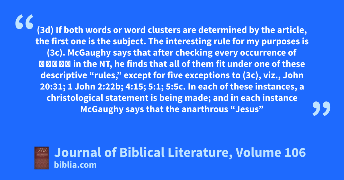 (3d) If both words or word clusters are determined by the article, the first one is the subject. The interesting rule for my purposes is (3c). McGaughy says that after checking every occurrence of ἐστίν in the NT, he finds that all of them fit under one of these descriptive “rules,” except for five exceptions to (3c), viz., John 20:31; 1 John 2:22b; 4:15; 5:1; 5:5c. In each of these instances, a christological statement is being made; and in each instance McGaughy says that the anarthrous “Jesus”