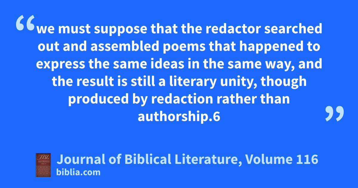 we must suppose that the redactor searched out and assembled poems that happened to express the same ideas in the same way, and the result is still a literary unity, though produced by redaction rather than authorship.6
