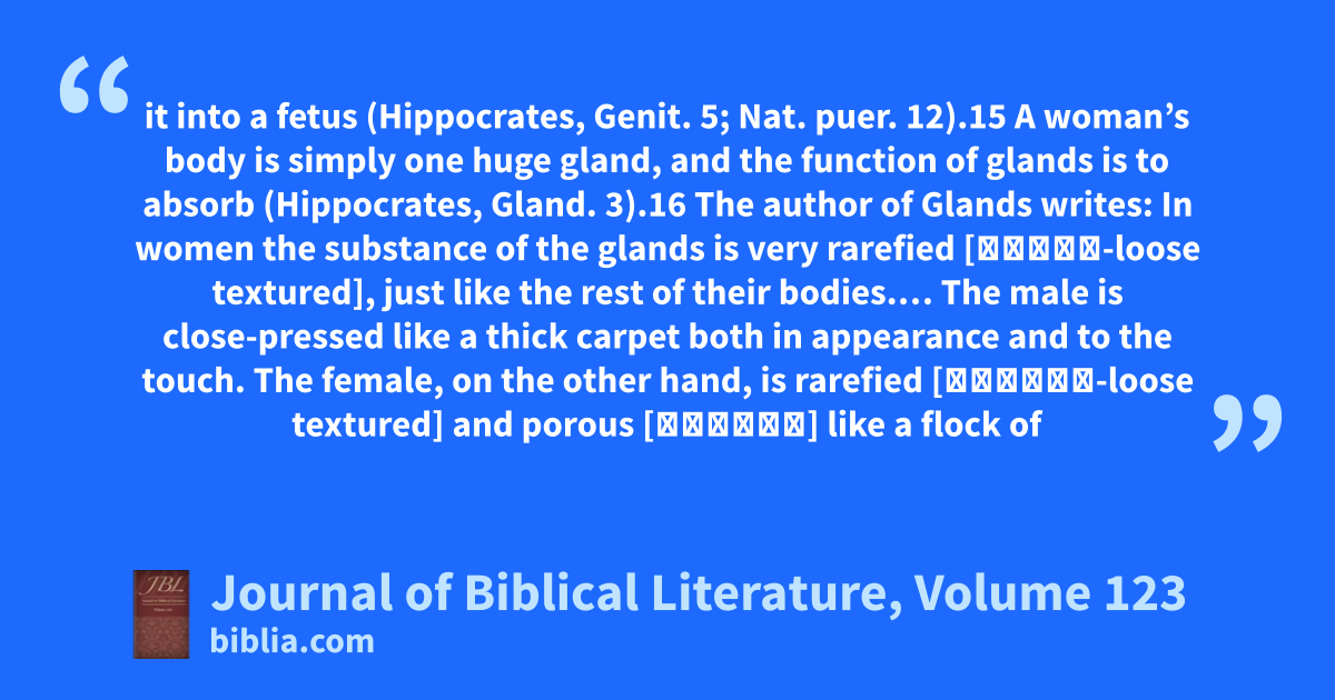 it into a fetus (Hippocrates, Genit. 5; Nat. puer. 12).15 A woman’s body is simply one huge gland, and the function of glands is to absorb (Hippocrates, Gland. 3).16 The author of Glands writes: In women the substance of the glands is very rarefied [ἀραιή-loose textured], just like the rest of their bodies.… The male is close-pressed like a thick carpet both in appearance and to the touch. The female, on the other hand, is rarefied [ἀραιόν-loose textured] and porous [χαῦνον] like a flock of