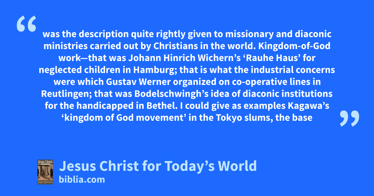 was the description quite rightly given to missionary and diaconic ministries carried out by Christians in the world. Kingdom-of-God work—that was Johann Hinrich Wichern’s ‘Rauhe Haus’ for neglected children in Hamburg; that is what the industrial concerns were which Gustav Werner organized on co-operative lines in Reutlingen; that was Bodelschwingh’s idea of diaconic institutions for the handicapped in Bethel. I could give as examples Kagawa’s ‘kingdom of God movement’ in the Tokyo slums, the base