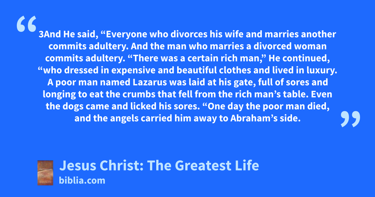 3And He said, “Everyone who divorces his wife and marries another commits adultery. And the man who marries a divorced woman commits adultery. “There was a certain rich man,” He continued, “who dressed in expensive and beautiful clothes and lived in luxury. A poor man named Lazarus was laid at his gate, full of sores and longing to eat the crumbs that fell from the rich man’s table. Even the dogs came and licked his sores. “One day the poor man died, and the angels carried him away to Abraham’s side.