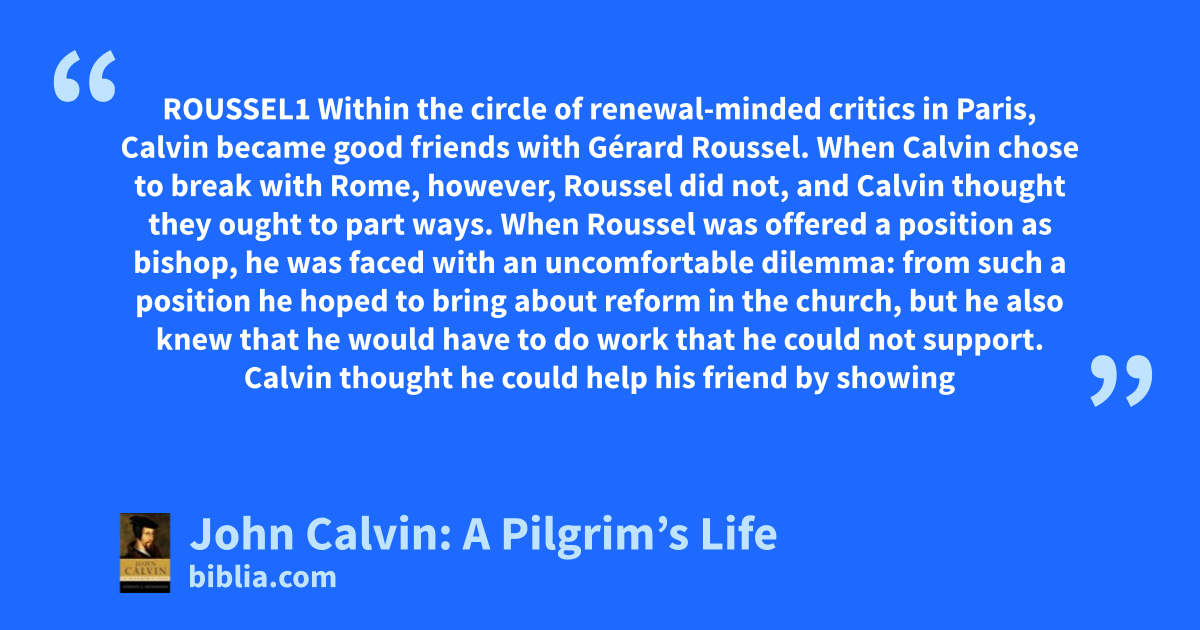 ROUSSEL1 Within the circle of renewal-minded critics in Paris, Calvin became good friends with Gérard Roussel. When Calvin chose to break with Rome, however, Roussel did not, and Calvin thought they ought to part ways. When Roussel was offered a position as bishop, he was faced with an uncomfortable dilemma: from such a position he hoped to bring about reform in the church, but he also knew that he would have to do work that he could not support. Calvin thought he could help his friend by showing