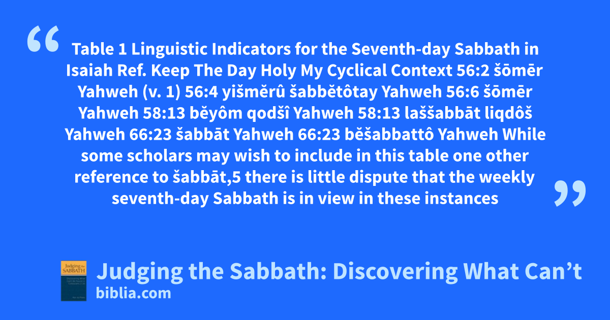 Table 1 Linguistic Indicators for the Seventh-day Sabbath in Isaiah Ref. Keep The Day Holy My Cyclical Context 56:2 šōmēr Yahweh (v. 1) 56:4 yišmĕrû šabbĕtôtay Yahweh 56:6 šōmēr Yahweh 58:13 bĕyôm qodšî Yahweh 58:13 laššabbāt liqdôš Yahweh 66:23 šabbāt Yahweh 66:23 bĕšabbattô Yahweh While some scholars may wish to include in this table one other reference to šabbāt,5 there is little dispute that the weekly seventh-day Sabbath is in view in these instances