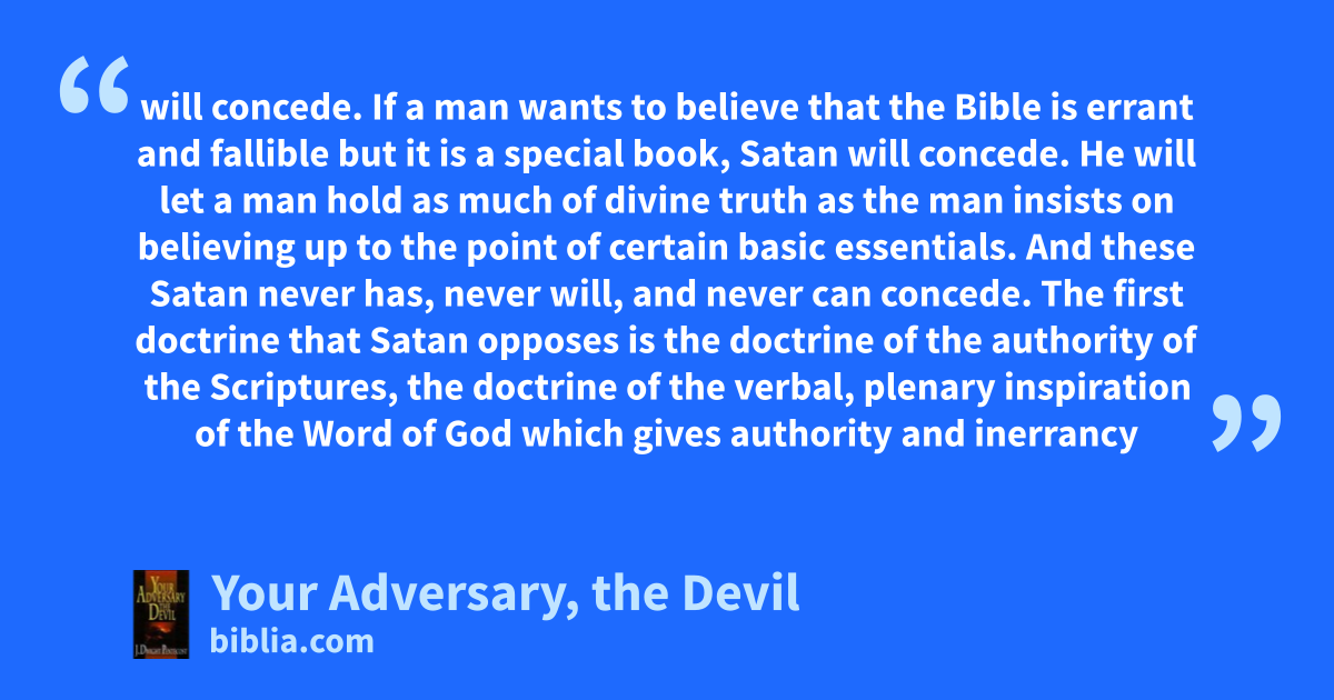 will concede. If a man wants to believe that the Bible is errant and fallible but it is a special book, Satan will concede. He will let a man hold as much of divine truth as the man insists on believing up to the point of certain basic essentials. And these Satan never has, never will, and never can concede. The first doctrine that Satan opposes is the doctrine of the authority of the Scriptures, the doctrine of the verbal, plenary inspiration of the Word of God which gives authority and inerrancy