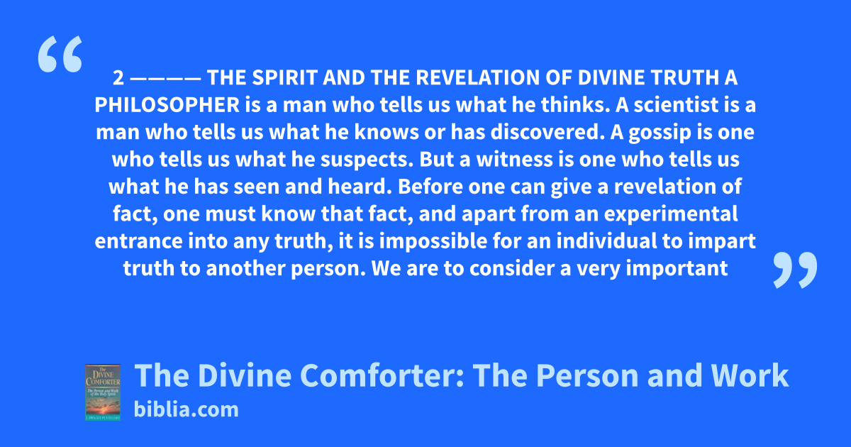 “…he shall give you another Comforter, that he may abide with you forever.” —John 14:16 Personal, intimate fellowship between the believer and the Spirit is essential for spiritual growth. God's purpose in redemption is to bring believers into fellowship with Himself. He has therefore given the believer a mind to know Him, a heart to love Him, and a Person to commune with him—the person of the...