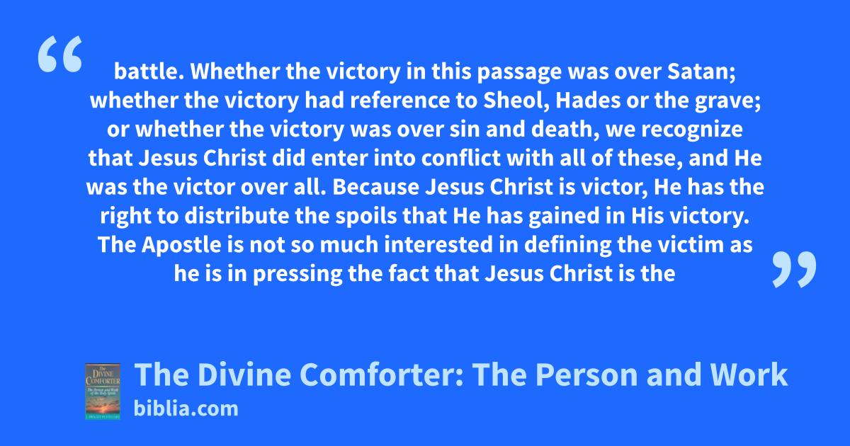 battle. Whether the victory in this passage was over Satan; whether the victory had reference to Sheol, Hades or the grave; or whether the victory was over sin and death, we recognize that Jesus Christ did enter into conflict with all of these, and He was the victor over all. Because Jesus Christ is victor, He has the right to distribute the spoils that He has gained in His victory. The Apostle is not so much interested in defining the victim as he is in pressing the fact that Jesus Christ is the