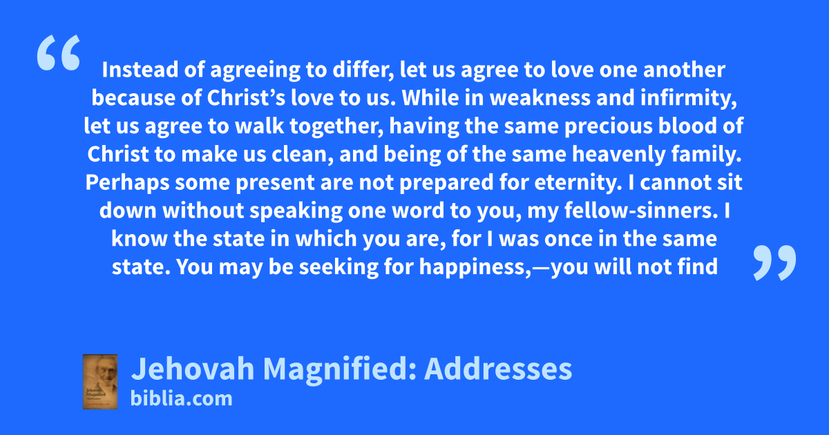 Instead of agreeing to differ, let us agree to love one another because of Christ’s love to us. While in weakness and infirmity, let us agree to walk together, having the same precious blood of Christ to make us clean, and being of the same heavenly family. Perhaps some present are not prepared for eternity. I cannot sit down without speaking one word to you, my fellow-sinners. I know the state in which you are, for I was once in the same state. You may be seeking for happiness,—you will not find