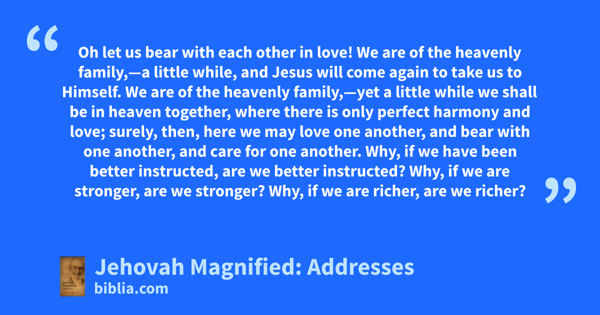 Oh let us bear with each other in love! We are of the heavenly family,—a little while, and Jesus will come again to take us to Himself. We are of the heavenly family,—yet a little while we shall be in heaven together, where there is only perfect harmony and love; surely, then, here we may love one another, and bear with one another, and care for one another. Why, if we have been better instructed, are we better instructed? Why, if we are stronger, are we stronger? Why, if we are richer, are we richer?
