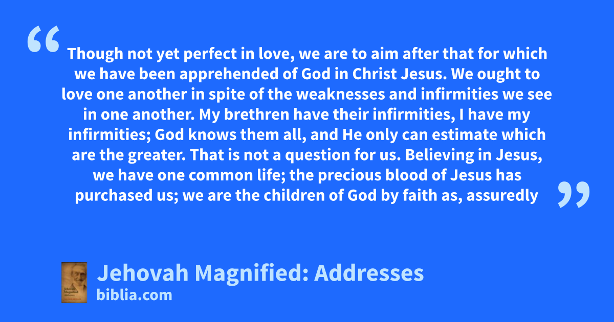 Though not yet perfect in love, we are to aim after that for which we have been apprehended of God in Christ Jesus. We ought to love one another in spite of the weaknesses and infirmities we see in one another. My brethren have their infirmities, I have my infirmities; God knows them all, and He only can estimate which are the greater. That is not a question for us. Believing in Jesus, we have one common life; the precious blood of Jesus has purchased us; we are the children of God by faith as, assuredly