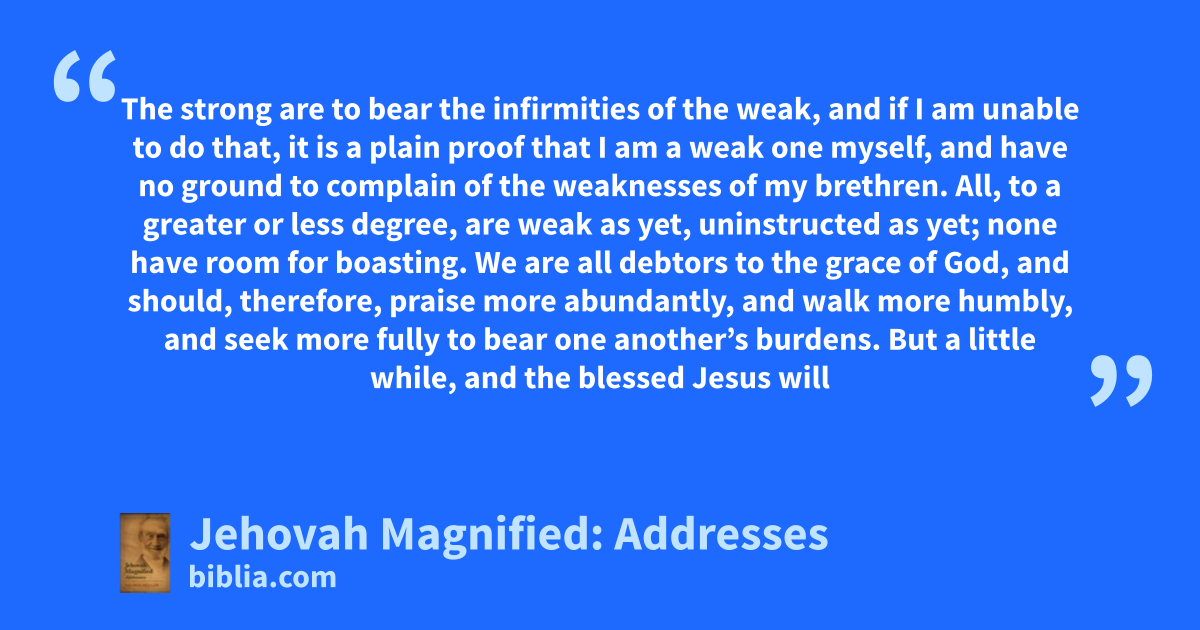 The strong are to bear the infirmities of the weak, and if I am unable to do that, it is a plain proof that I am a weak one myself, and have no ground to complain of the weaknesses of my brethren. All, to a greater or less degree, are weak as yet, uninstructed as yet; none have room for boasting. We are all debtors to the grace of God, and should, therefore, praise more abundantly, and walk more humbly, and seek more fully to bear one another’s burdens. But a little while, and the blessed Jesus will
