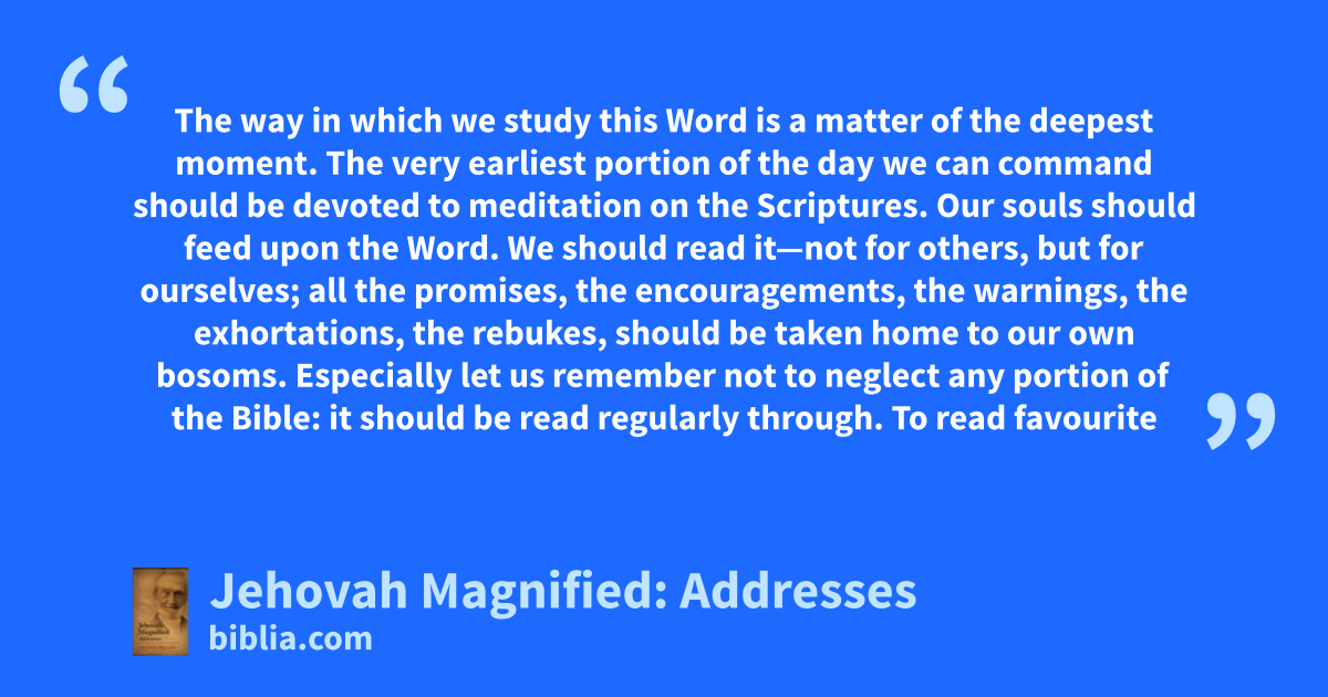 The way in which we study this Word is a matter of the deepest moment. The very earliest portion of the day we can command should be devoted to meditation on the Scriptures. Our souls should feed upon the Word. We should read it—not for others, but for ourselves; all the promises, the encouragements, the warnings, the exhortations, the rebukes, should be taken home to our own bosoms. Especially let us remember not to neglect any portion of the Bible: it should be read regularly through. To read favourite