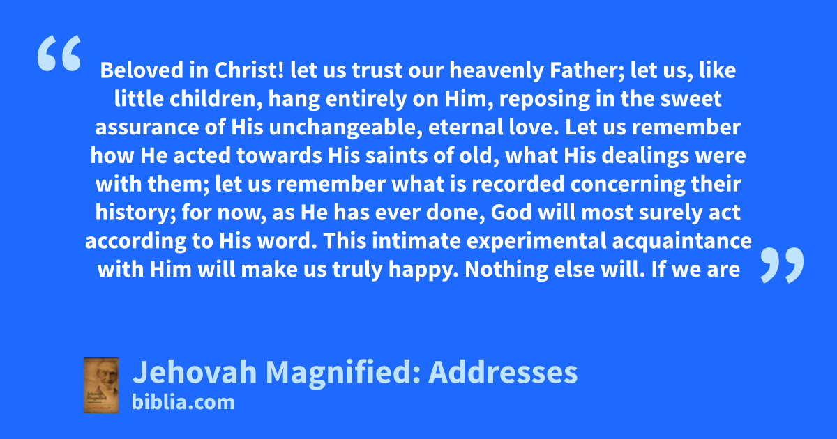Beloved in Christ! let us trust our heavenly Father; let us, like little children, hang entirely on Him, reposing in the sweet assurance of His unchangeable, eternal love. Let us remember how He acted towards His saints of old, what His dealings were with them; let us remember what is recorded concerning their history; for now, as He has ever done, God will most surely act according to His word. This intimate experimental acquaintance with Him will make us truly happy. Nothing else will. If we are