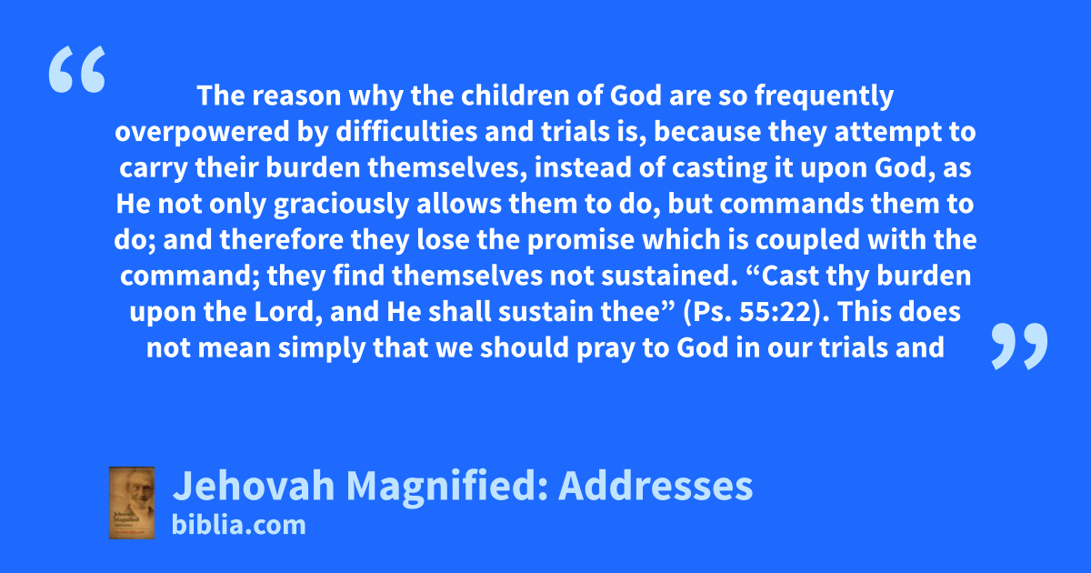 The reason why the children of God are so frequently overpowered by difficulties and trials is, because they attempt to carry their burden themselves, instead of casting it upon God, as He not only graciously allows them to do, but commands them to do; and therefore they lose the promise which is coupled with the command; they find themselves not sustained. “Cast thy burden upon the Lord, and He shall sustain thee” (Ps. 55:22). This does not mean simply that we should pray to God in our trials and