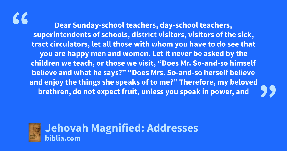 Dear Sunday-school teachers, day-school teachers, superintendents of schools, district visitors, visitors of the sick, tract circulators, let all those with whom you have to do see that you are happy men and women. Let it never be asked by the children we teach, or those we visit, “Does Mr. So-and-so himself believe and what he says?” “Does Mrs. So-and-so herself believe and enjoy the things she speaks of to me?” Therefore, my beloved brethren, do not expect fruit, unless you speak in power, and