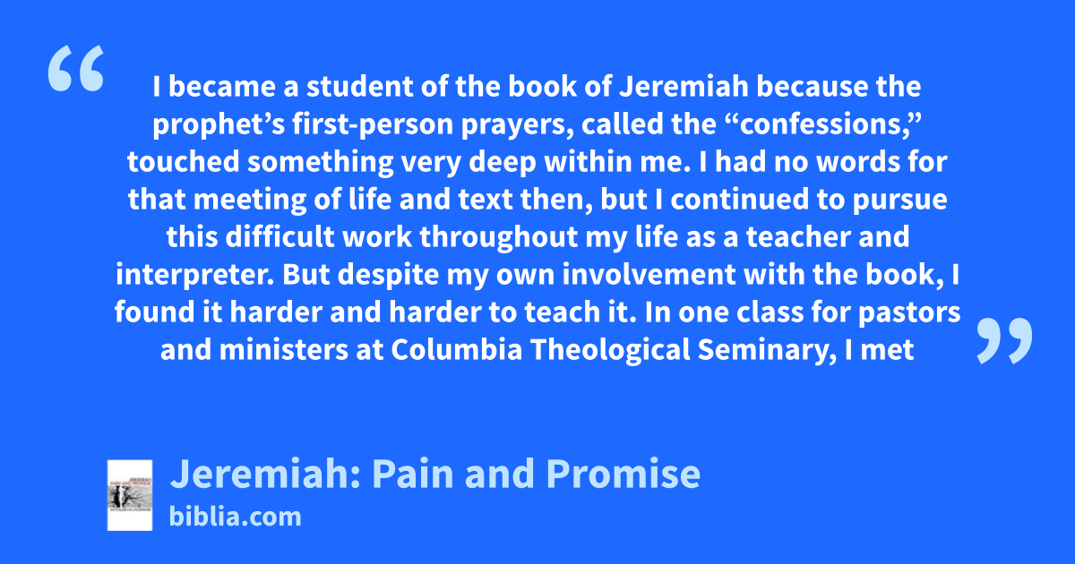 I became a student of the book of Jeremiah because the prophet’s first-person prayers, called the “confessions,” touched something very deep within me. I had no words for that meeting of life and text then, but I continued to pursue this difficult work throughout my life as a teacher and interpreter. But despite my own involvement with the book, I found it harder and harder to teach it. In one class for pastors and ministers at Columbia Theological Seminary, I met