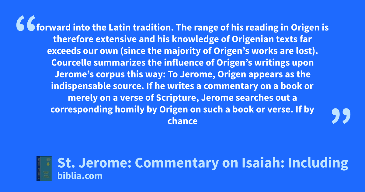 forward into the Latin tradition. The range of his reading in Origen is therefore extensive and his knowledge of Origenian texts far exceeds our own (since the majority of Origen’s works are lost). Courcelle summarizes the influence of Origen’s writings upon Jerome’s corpus this way: To Jerome, Origen appears as the indispensable source. If he writes a commentary on a book or merely on a verse of Scripture, Jerome searches out a corresponding homily by Origen on such a book or verse. If by chance