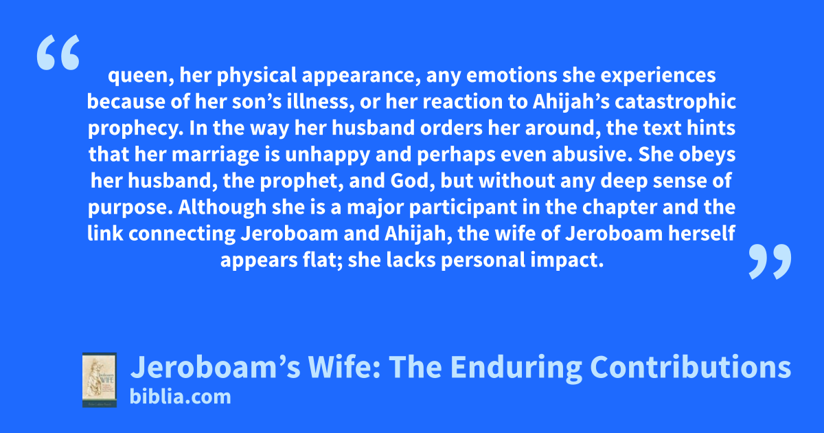 queen, her physical appearance, any emotions she experiences because of her son’s illness, or her reaction to Ahijah’s catastrophic prophecy. In the way her husband orders her around, the text hints that her marriage is unhappy and perhaps even abusive. She obeys her husband, the prophet, and God, but without any deep sense of purpose. Although she is a major participant in the chapter and the link connecting Jeroboam and Ahijah, the wife of Jeroboam herself appears flat; she lacks personal impact.