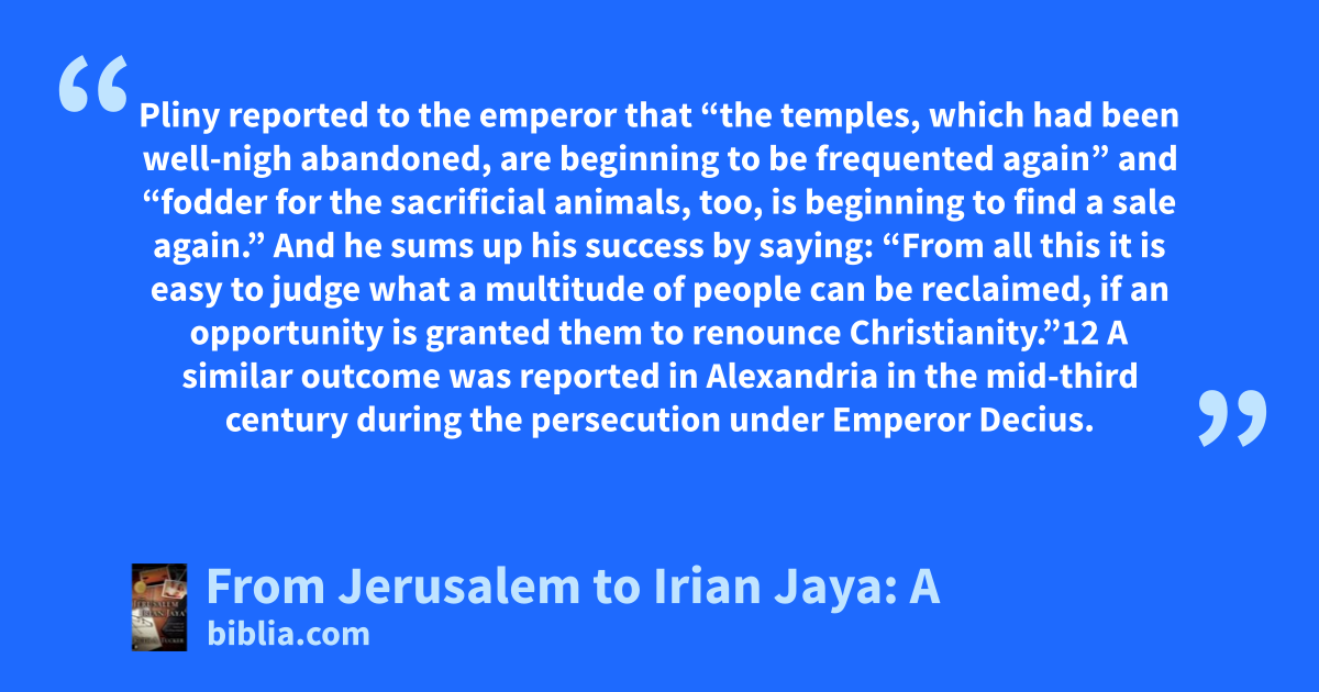 Pliny reported to the emperor that “the temples, which had been well-nigh abandoned, are beginning to be frequented again” and “fodder for the sacrificial animals, too, is beginning to find a sale again.” And he sums up his success by saying: “From all this it is easy to judge what a multitude of people can be reclaimed, if an opportunity is granted them to renounce Christianity.”12 A similar outcome was reported in Alexandria in the mid-third century during the persecution under Emperor Decius.