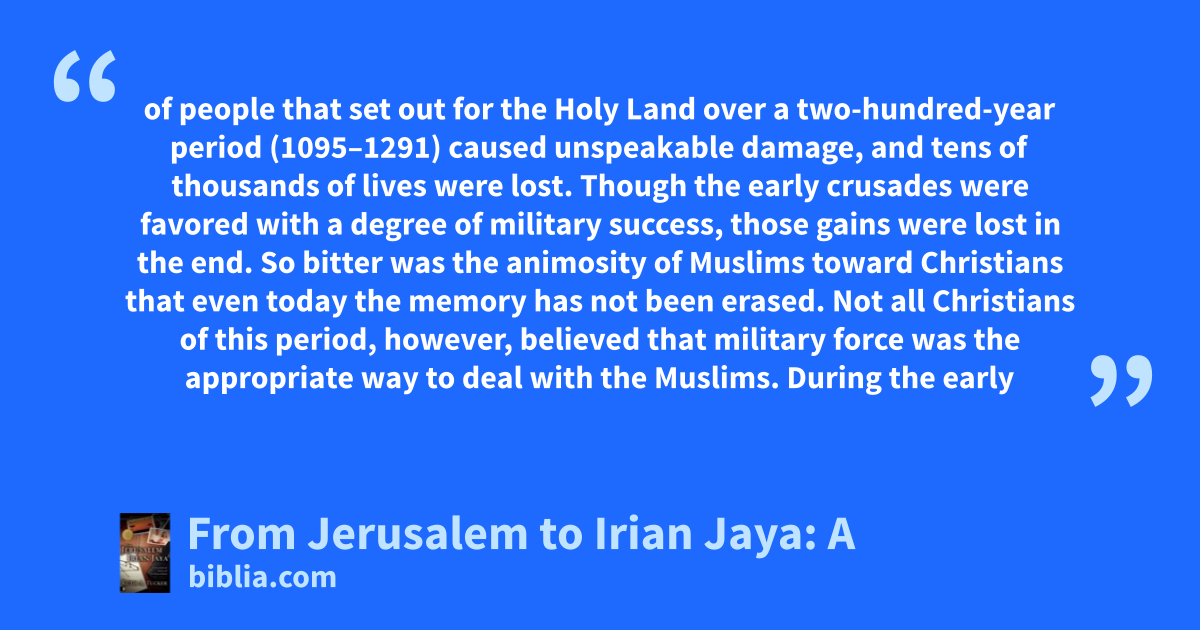 of people that set out for the Holy Land over a two-hundred-year period (1095–1291) caused unspeakable damage, and tens of thousands of lives were lost. Though the early crusades were favored with a degree of military success, those gains were lost in the end. So bitter was the animosity of Muslims toward Christians that even today the memory has not been erased. Not all Christians of this period, however, believed that military force was the appropriate way to deal with the Muslims. During the early