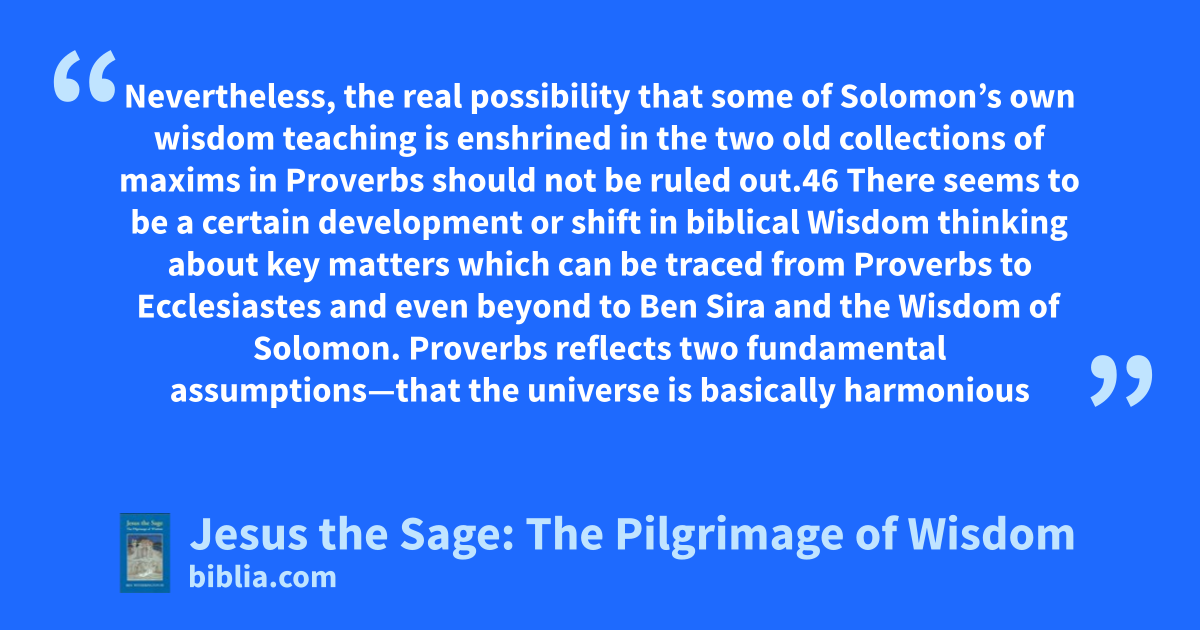 Nevertheless, the real possibility that some of Solomon’s own wisdom teaching is enshrined in the two old collections of maxims in Proverbs should not be ruled out.46 There seems to be a certain development or shift in biblical Wisdom thinking about key matters which can be traced from Proverbs to Ecclesiastes and even beyond to Ben Sira and the Wisdom of Solomon. Proverbs reflects two fundamental assumptions—that the universe is basically harmonious