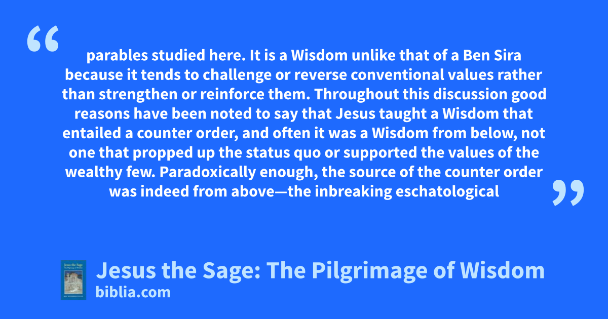 parables studied here. It is a Wisdom unlike that of a Ben Sira because it tends to challenge or reverse conventional values rather than strengthen or reinforce them. Throughout this discussion good reasons have been noted to say that Jesus taught a Wisdom that entailed a counter order, and often it was a Wisdom from below, not one that propped up the status quo or supported the values of the wealthy few. Paradoxically enough, the source of the counter order was indeed from above—the inbreaking eschatological