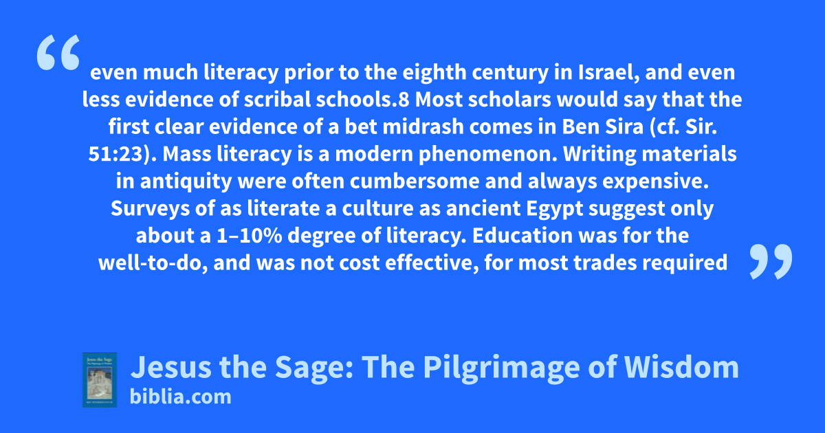 even much literacy prior to the eighth century in Israel, and even less evidence of scribal schools.8 Most scholars would say that the first clear evidence of a bet midrash comes in Ben Sira (cf. Sir. 51:23). Mass literacy is a modern phenomenon. Writing materials in antiquity were often cumbersome and always expensive. Surveys of as literate a culture as ancient Egypt suggest only about a 1–10% degree of literacy. Education was for the well-to-do, and was not cost effective, for most trades required