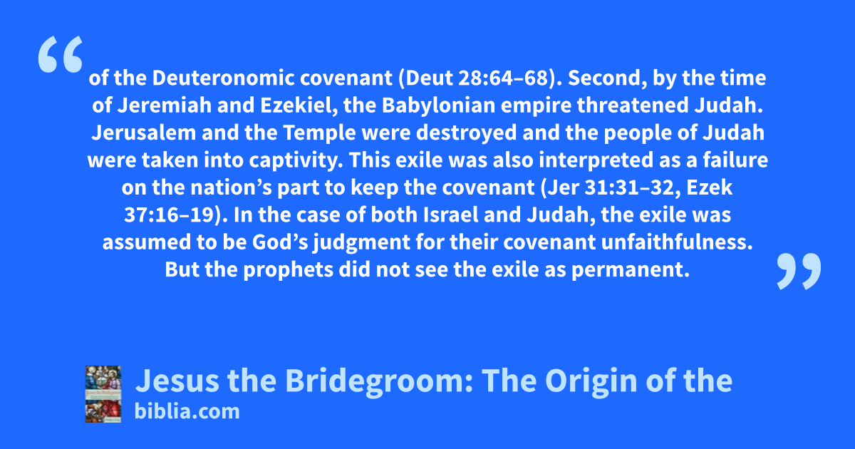 of the Deuteronomic covenant (Deut 28:64–68). Second, by the time of Jeremiah and Ezekiel, the Babylonian empire threatened Judah. Jerusalem and the Temple were destroyed and the people of Judah were taken into captivity. This exile was also interpreted as a failure on the nation’s part to keep the covenant (Jer 31:31–32, Ezek 37:16–19). In the case of both Israel and Judah, the exile was assumed to be God’s judgment for their covenant unfaithfulness. But the prophets did not see the exile as permanent.