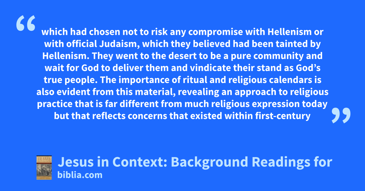 which had chosen not to risk any compromise with Hellenism or with official Judaism, which they believed had been tainted by Hellenism. They went to the desert to be a pure community and wait for God to deliver them and vindicate their stand as God’s true people. The importance of ritual and religious calendars is also evident from this material, revealing an approach to religious practice that is far different from much religious expression today but that reflects concerns that existed within first-century