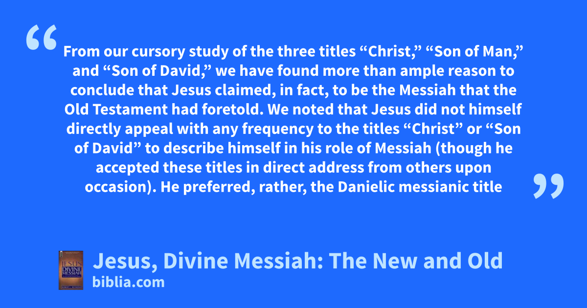 From our cursory study of the three titles “Christ,” “Son of Man,” and “Son of David,” we have found more than ample reason to conclude that Jesus claimed, in fact, to be the Messiah that the Old Testament had foretold. We noted that Jesus did not himself directly appeal with any frequency to the titles “Christ” or “Son of David” to describe himself in his role of Messiah (though he accepted these titles in direct address from others upon occasion). He preferred, rather, the Danielic messianic title