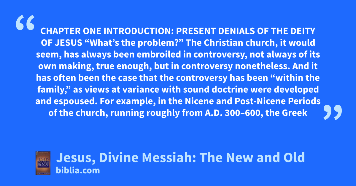 CHAPTER ONE INTRODUCTION: PRESENT DENIALS OF THE DEITY OF JESUS “What’s the problem?” The Christian church, it would seem, has always been embroiled in controversy, not always of its own making, true enough, but in controversy nonetheless. And it has often been the case that the controversy has been “within the family,” as views at variance with sound doctrine were developed and espoused. For example, in the Nicene and Post-Nicene Periods of the church, running roughly from A.D. 300–600, the Greek