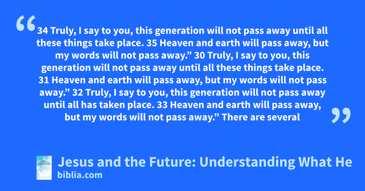34 Truly, I say to you, this generation will not pass away until all these things take place. 35 Heaven and earth will pass away, but my words will not pass away.” 30 Truly, I say to you, this generation will not pass away until all these things take place. 31 Heaven and earth will pass away, but my words will not pass away.” 32 Truly, I say to you, this generation will not pass away until all has taken place. 33 Heaven and earth will pass away, but my words will not pass away.” There are several