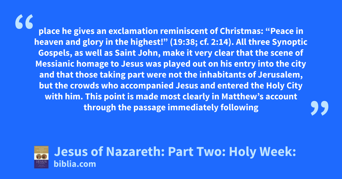 place he gives an exclamation reminiscent of Christmas: “Peace in heaven and glory in the highest!” (19:38; cf. 2:14). All three Synoptic Gospels, as well as Saint John, make it very clear that the scene of Messianic homage to Jesus was played out on his entry into the city and that those taking part were not the inhabitants of Jerusalem, but the crowds who accompanied Jesus and entered the Holy City with him. This point is made most clearly in Matthew’s account through the passage immediately following