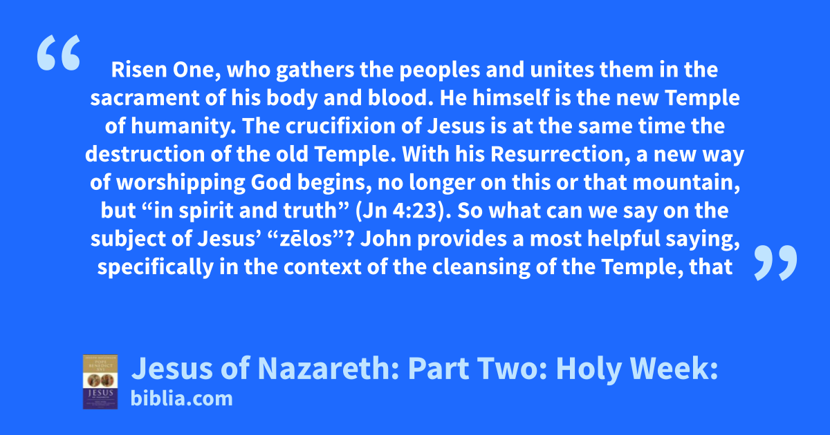 Risen One, who gathers the peoples and unites them in the sacrament of his body and blood. He himself is the new Temple of humanity. The crucifixion of Jesus is at the same time the destruction of the old Temple. With his Resurrection, a new way of worshipping God begins, no longer on this or that mountain, but “in spirit and truth” (Jn 4:23). So what can we say on the subject of Jesus’ “zēlos”? John provides a most helpful saying, specifically in the context of the cleansing of the Temple, that