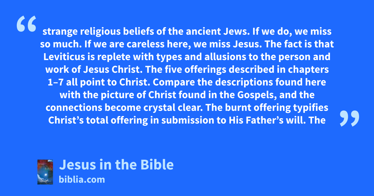 strange religious beliefs of the ancient Jews. If we do, we miss so much. If we are careless here, we miss Jesus. The fact is that Leviticus is replete with types and allusions to the person and work of Jesus Christ. The five offerings described in chapters 1–7 all point to Christ. Compare the descriptions found here with the picture of Christ found in the Gospels, and the connections become crystal clear. The burnt offering typifies Christ’s total offering in submission to His Father’s will. The