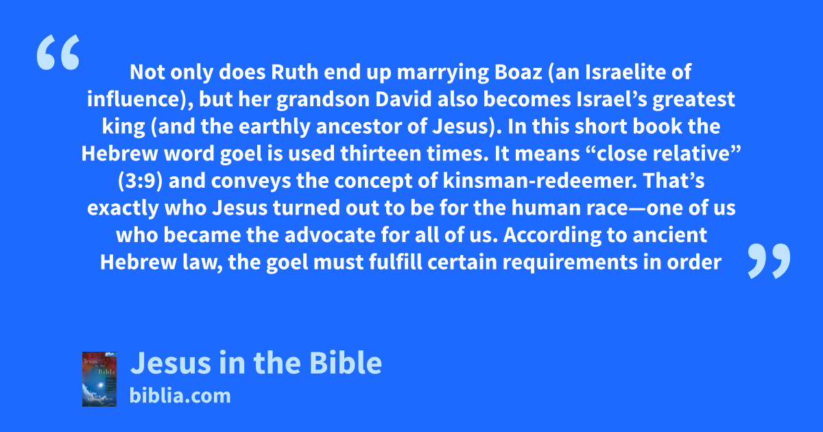 Not only does Ruth end up marrying Boaz (an Israelite of influence), but her grandson David also becomes Israel’s greatest king (and the earthly ancestor of Jesus). In this short book the Hebrew word goel is used thirteen times. It means “close relative” (3:9) and conveys the concept of kinsman-redeemer. That’s exactly who Jesus turned out to be for the human race—one of us who became the advocate for all of us. According to ancient Hebrew law, the goel must fulfill certain requirements in order