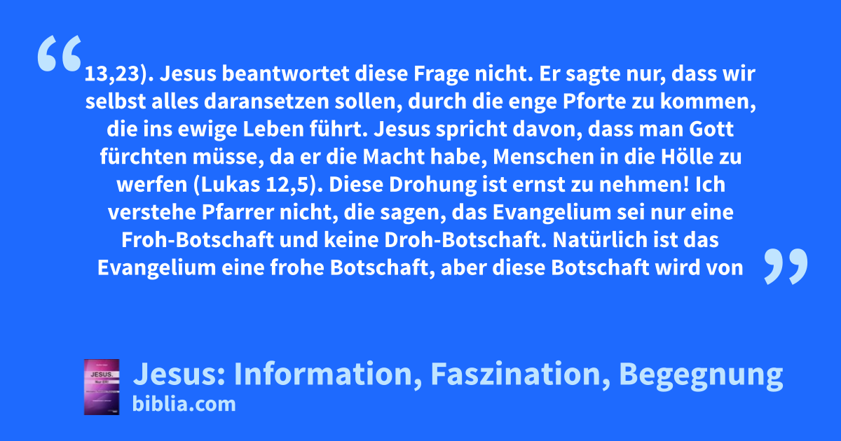 13,23). Jesus beantwortet diese Frage nicht. Er sagte nur, dass wir selbst alles daransetzen sollen, durch die enge Pforte zu kommen, die ins ewige Leben führt. Jesus spricht davon, dass man Gott fürchten müsse, da er die Macht habe, Menschen in die Hölle zu werfen (Lukas 12,5). Diese Drohung ist ernst zu nehmen! Ich verstehe Pfarrer nicht, die sagen, das Evangelium sei nur eine Froh-Botschaft und keine Droh-Botschaft. Natürlich ist das Evangelium eine frohe Botschaft, aber diese Botschaft wird von