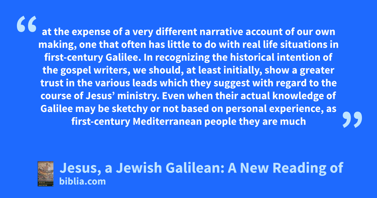 at the expense of a very different narrative account of our own making, one that often has little to do with real life situations in first-century Galilee. In recognizing the historical intention of the gospel writers, we should, at least initially, show a greater trust in the various leads which they suggest with regard to the course of Jesus’ ministry. Even when their actual knowledge of Galilee may be sketchy or not based on personal experience, as first-century Mediterranean people they are much