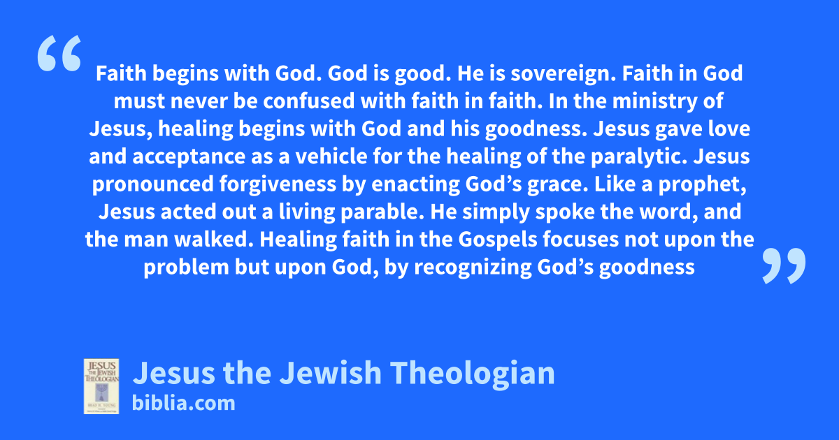 Faith begins with God. God is good. He is sovereign. Faith in God must never be confused with faith in faith. In the ministry of Jesus, healing begins with God and his goodness. Jesus gave love and acceptance as a vehicle for the healing of the paralytic. Jesus pronounced forgiveness by enacting God’s grace. Like a prophet, Jesus acted out a living parable. He simply spoke the word, and the man walked. Healing faith in the Gospels focuses not upon the problem but upon God, by recognizing God’s goodness