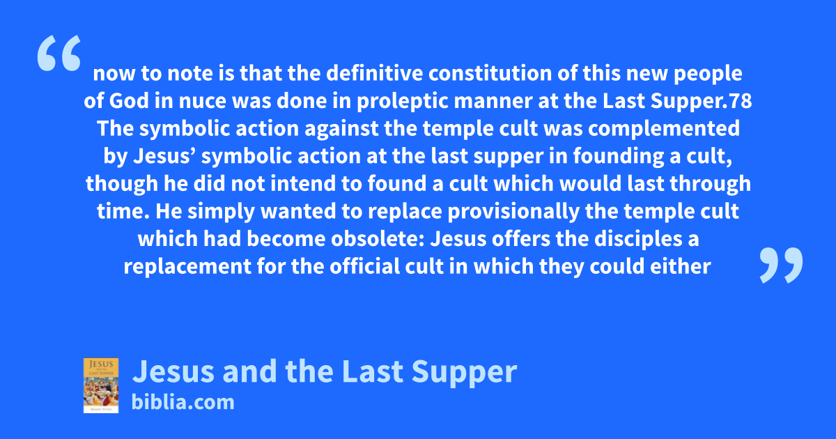 now to note is that the definitive constitution of this new people of God in nuce was done in proleptic manner at the Last Supper.78 The symbolic action against the temple cult was complemented by Jesus’ symbolic action at the last supper in founding a cult, though he did not intend to found a cult which would last through time. He simply wanted to replace provisionally the temple cult which had become obsolete: Jesus offers the disciples a replacement for the official cult in which they could either
