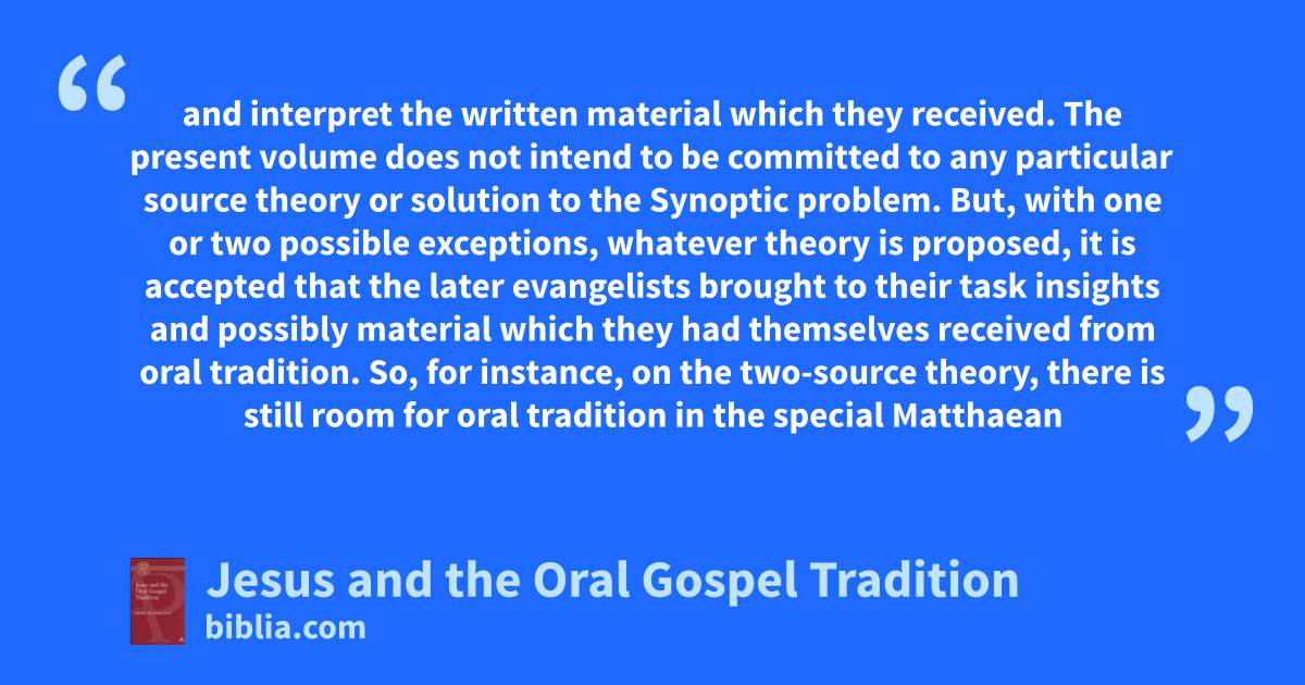 and interpret the written material which they received. The present volume does not intend to be committed to any particular source theory or solution to the Synoptic problem. But, with one or two possible exceptions, whatever theory is proposed, it is accepted that the later evangelists brought to their task insights and possibly material which they had themselves received from oral tradition. So, for instance, on the two-source theory, there is still room for oral tradition in the special Matthaean