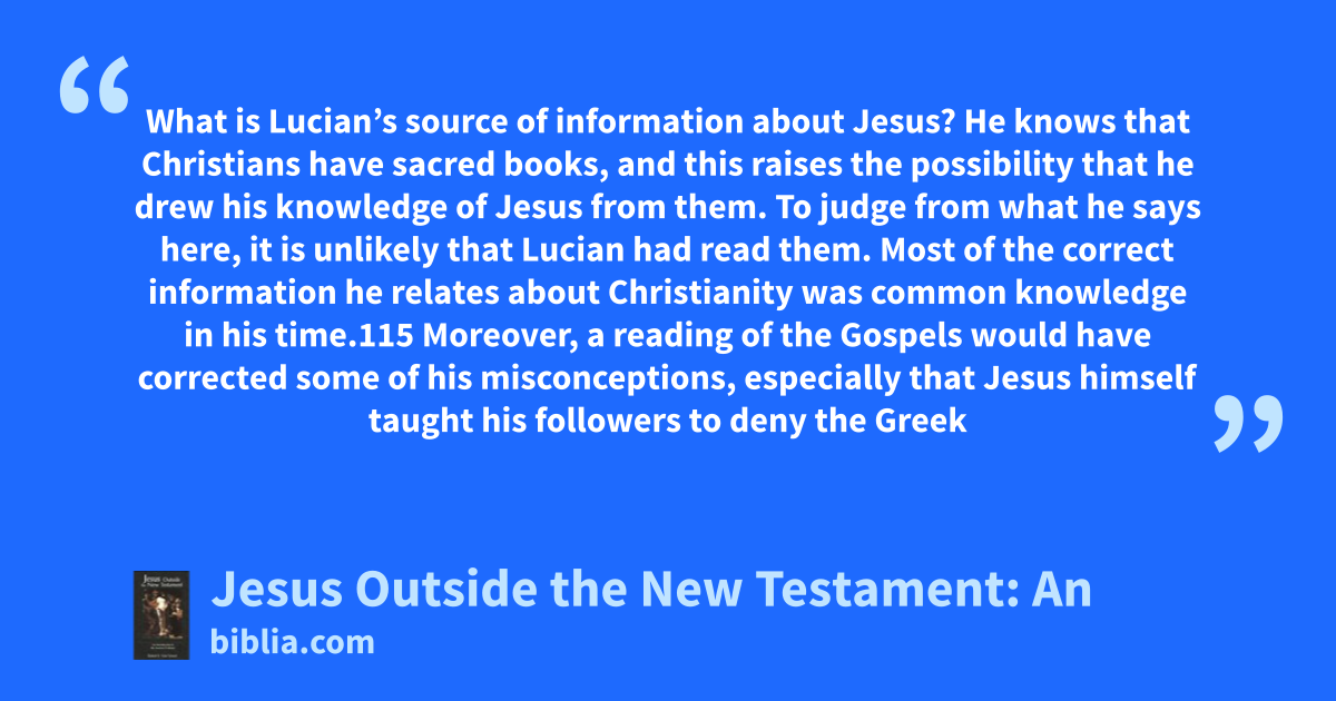 What is Lucian’s source of information about Jesus? He knows that Christians have sacred books, and this raises the possibility that he drew his knowledge of Jesus from them. To judge from what he says here, it is unlikely that Lucian had read them. Most of the correct information he relates about Christianity was common knowledge in his time.115 Moreover, a reading of the Gospels would have corrected some of his misconceptions, especially that Jesus himself taught his followers to deny the Greek